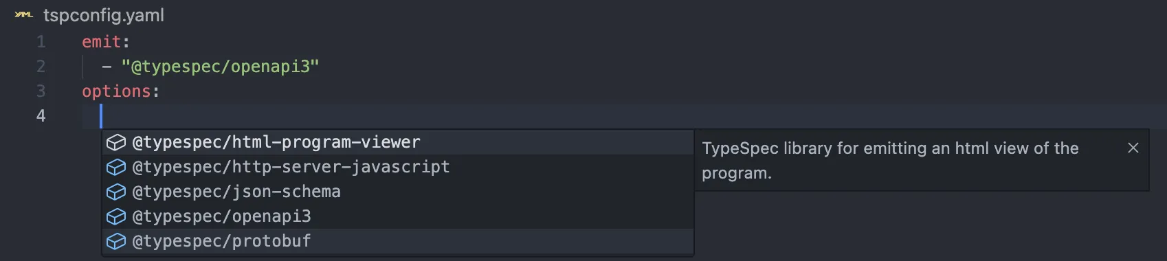 Section titled “tspconfig.yaml auto complete”TypeSpec Language server now provide completion for the tspconfig.yaml file. It will auto complete the structure, available emitters and their options.